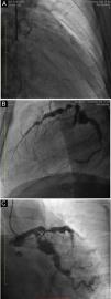 Single-plane fluoroscopy (Figure 1A) and coronary angiography showed a giant calcified aneurysm (73 mm×72 mm) of the mid-right coronary artery (RCA), and smaller aneurysms that were proximal and distal to the first. The proximal RCA was occluded by a thrombus (Figure 1B) so percutaneous revascularization could not be performed. The left coronary artery had multiple calcified aneurysms, and severe stenosis of the proximal anterior descending coronary artery (Figures 2A–C) was found. We performed ascending aortography, which was normal. These findings could be related to Kawasaki disease (KD). Despite good evolution following cardiogenic shock, the patient had upper gastrointestinal bleeding, a major and acute complication, which was fatal.