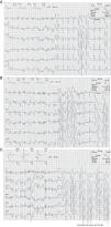 Traçado eletrocardiográfico obtido durante a prova de esforço aos 8:59min, pico de esforço (imagem A), aos cinco segundos da recuperação (imagem B) e aos nove segundos da recuperação (imagem C).