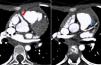 Para confirmação diagnóstica realizou Angio – TAC coronária que mostrou tronco comum da ACE com origem na vertente inferior esquerda do TAP, a cerca de 10mm da raiz da aorta (Figuras 2 e 3). Esta distância levantou dúvidas sobre a possibilidade de transferência direta da ACE para aorta. Por apresentar períodos de frequências cardíacas mais elevadas (apesar de fármaco cronotrópico negativo) e artefactos de imagem secundários a movimento, apenas foi possível definir o trajeto proximal das coronárias.