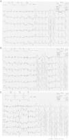 Electrocardiographic traces, at peak exercise 8.59 min into test (A), at 5 s into recovery (B), and at 9 s into recovery (C).