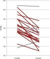 Seguimento aos seis mesesDos 22 doentes com seguimento completo aos seis meses após a DNR, 18 (81,8%) alcançaram o objetivo primário do estudo, sendo considerados respondedores (Figura 2). Dos quatro doentes não respondedores, apenas um apresentou elevação da pressão arterial comparativamente ao valor basal, enquanto os outros três tiveram redução inferior a 10mmHg. A PAS avaliada na consulta diminuiu em média 22mmHg, sendo esta redução estatisticamente significativa (174±23 versus 152±22mmHg; p<0,001). A PAD também diminuiu de forma estatisticamente significativa, em média 9mmHg (89±16 versus 80±11mmHg; p=0,006) (Figura 3). Outros parâmetros que se modificaram de forma significativa aos seis meses após a DNR foram a percentagem de cargas diastólicas na MAPA 24h (45±29 versus 27±26%; p=0,049) e o IMVE (174±56 versus 158±60g/m2; p=0,014). Os parâmetros ecocardiográficos de avaliação da função sistólica e diastólica que foram analisados não se modificaram de forma estatisticamente significativa. Da mesma forma, a creatinina sérica também não se alterou (1,0±0,3 versus 1,0±0,4mg/dl; p=0,344) (Tabela 2). O número de fármacos anti‐hipertensores (5,5±1,0 versus 4,6±1,1; p=0,010) e de classes farmacológicas (5,4±0,7 versus 4,6±1,1; p=0,009) diminuiu significativamente após a DNR. Não foi possível efetuar qualquer análise comparativa entre os diferentes sistemas de desnervação porque os doentes tratados com os sistemas OneShot® (n=2) e EnligHTN® (n=6) não atingiram ainda o tempo de seguimento estudado (seis meses). A sua inclusão neste trabalho serve de qualquer modo para descrever as características basais dos doentes selecionados para a DNR, bem como a sua segurança imediata.