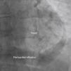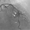 A 69-year-old man was referred for PCI of a 90% calcified lesion in the mid left anterior descending artery (LAD) involving the second diagonal branch (D2; Figure 1, arrow). After the left coronary ostium was cannulated and crossed with two BMW® wires, one to the LAD and other to the D2, predilation with a 2.5 mm×15mm Trek® balloon was performed and an unsuccessful attempt was made to cross the stenosis with a 2.75 mm×22mm Resolute Integrity® drug-eluting stent. Predilation was repeated with a 2.75 mm×15mm Trek® non-compliant balloon at high pressure. Suddenly, balloon rupture was detected and the angiogram showed LAD rupture with extensive contrast extravasation into the pericardium (Figure 2, arrows; Video 1). Protamine sulfate was used to reverse the effect of heparin and the drug-eluting stent was deployed with balloon inflation for 10minutes to seal the type III perforation but, as dye extrava- sation persisted, a 3.0 mm×19mm GraftMaster® covered stent was superimposed, followed by rapid cessation of contrast leakage (Video 2). The D2 branch was lost (Figure 3, arrows), and periprocedural myocardial infarction occurred. The final image showed pericardial effusion (Figure 4; Video 3). The echocardiogram excluded tamponade. Forty-eight hours later, atrial fibrillation occurred with hemodynamic deterioration. Pericardiocentesis was performed and 50ml of serosanguineous fluid was drained. Sinus rhythm was restored, with favorable evolution thereafter.
