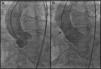 A 90-year-old female with severe symptomatic aortic stenosis was admitted for transcatheter aortic valve implantation (TAVI). A 26-mm Edwards SAPIEN valve was implanted through a transfemoral approach. After the final aortic angiogram a subtraction image was noted from the aortic root just above the right coronary sinus (RCS) to the mid ascending aorta (Figure 1). The intracardiac echocardiogram suggested an aortic dissection, showing an enlarged ascending aorta with an intimal flap without clear flow in the false lumen (Figure 2). The hypothesis of dissection caused by a small tear at the level of the RCS was confirmed by computed tomography (CT) (Figure 3). After heart team discussion it was decided to treat the complication conservatively, since the patient had no symptoms, and she was started on labetalol. A transthoracic echocardiogram was performed that showed good valvular performance without paravalvular leakage. The patient was discharged home after two days. Three months later her exercise capacity had improved and the control CT showed resolution of the dissection (Figure 4).