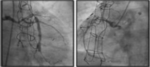 Preclinical studiesThe device’s feasibility, efficacy and safety were first tested in a study using porcine models.50 Feasibility and safety were assessed in one arm of the study and efficacy in the other. Overall implantation success was 100% in 32 animals, with no immediate procedure-related complications. In the safety arm (n=26), histological study of devices retrieved between the first and sixth months after implantation presented favorable tissue repair, with the central portion demonstrating progressive endothelialization in continuity with the remainder of the vessel lumen. No device-related complications such as migration, thrombosis, stenosis, occlusion or erosion were observed when the animals were sacrificed. In the efficacy arm, 22 animals underwent artificial constriction of the proximal circumflex artery; of these, eight presented wall motion abnormalities in this territory on pharmacological stress echocardiography with dobutamine and perfusion alterations on contrast echocardiography. The Reducer device was then implanted in four of these eight animals, in whom a 50% reduction in ischemia was seen at six months, compared to absence of improvement in the four untreated animals. In the untreated group, three out of four animals died prematurely, compared to no mortality in the treatment group.