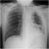 The chest radiography showed signs of pneumopericardium (Figure 1, long yellow arrows) and left cavitary lung mass. For better characterization, the patient underwent a computed tomography lung scan which revealed the extension (from the apex to the diaphragmatic surface) of the thick-walled gas-filled mass (Figure 2A/B, short black arrow) with an air-fluid level (Figure 2B, long black arrow) and distension of pericardial cavity with air-fluid level (Figure 2A/B, long yellow arrow) due to a direct pleuro-pericardial communication.