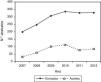 Em relação aos seus dois principais registos, o de síndromes coronárias agudas e o de cardiologia de intervenção, a evolução foi interessante. No primeiro, assistiu-se a um declínio progressivo na participação dos vários centros (fig. 1), com uma recuperação em 2011, a qual poderá ter estado associada ao aumento da exportação automática dos dados efetuada a partir de alguns centros. Por outro lado, no de cardiologia de intervenção, a entrada em serviço da exportação automática a partir das bases de dados existentes nos serviços em 2008 permitiu não só aumentar o número anual de doentes que foram introduzidos, mas também trazer alguma consistência e estabilidade à entrada de doentes, mais uma vez com um aumento observado em 2011 (fig. 2). Também poderá ter levado algum tempo a ser percebido, por parte dos serviços, a importância de juntar dados clínicos e experiências diversas, como base para aumentar a investigação clínica em Portugal.