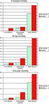 On analysis of the impact of anemia on mortality in the three groups classified according to the GRACE risk score, there was a significant difference in one-year mortality only, which was higher in the intermediate- and high-risk groups, with a trend for higher 30-day mortality in the high-risk group (Figure 1).
