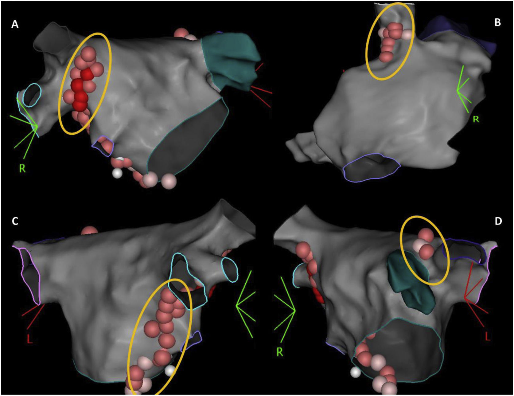 The 3-dimensional representation of the main ganglionated plexus (GP) location. Upper panel: (A) RAGP between the right upper pulmonary vein and the right atrium; (B) RSGP between the superior vena cava and aortic root just above the right upper pulmonary vein; lower panel: (C) RIGP at the roof of the coronary sinus and medial and just under the tricuspid valve and the coronary sinus ostium; (D) LSGP at superolateral area around the root of the left superior pulmonary vein.