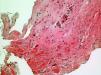 In order to better understand the hemodynamics, right heart catheterization was performed and revealed poor RV function with high filling pressures, normal pulmonary artery pressures, mildly depressed cardiac index, normal pulmonary capillary wedge pressure and normal pulmonary vascular resistance (Table 1). Importantly, a deep y descent with a rapid upstroke was noted (‘square root’ sign), suggesting severe diastolic filling impairment (Figure 1). To further clarify the myocardial disorder in the absence of pulmonary hypertension, CMR was performed, which showed diffuse infiltration of the myocardium (Figure 2). This was later confirmed by endomyocardial biopsy which was notable for diffuse myocardial fibrosis (Figure 3).