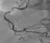 Transferido para centro com laboratório de hemodinâmica para realização de cateterismo cardíaco. Na admissão apresentava-se sem dor, estabilidade hemodinâmica, agitação psicomotora, desorientação espaciotemporal, classe de Killip 1 e ECG com ondas Q na parede anterior e inferior. O cateterismo cardíaco mostrou doença coronária de três vasos associando: estenose suboclusiva do segmento proximal da descendente anterior (DA) (culprit lesion), estenose suboclusiva do segmento proximal da coronária direita (CD) (culprit lesion) e estenose suboclusiva do segmento distal da circunflexa (Cx). Submetido a angioplastia da CD com implantação de dois stents DRIVER e da DA com um stent DRIVER. (Figuras 4 e 5)