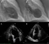 Contrast left ventriculography: diastolic (A) and systolic (B) frames showing motion abnormalities of the mid and apical segments. Transthoracic echocardiogram in 4-chamber apical view (systolic frames) revealing akinesia of mid-apical segments and apical ballooning (C), no longer present at discharge (D).