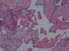 A 42-year-old man with a history of hypertension, type 2 diabetes mellitus and obesity was referred to our center due to the incidental finding of a mass adjacent to the pulmonary valve on a routine transthoracic echocardiogram (Figure 1). He was asymptomatic and physical examination and laboratory values were unremarkable. The transesophageal echocardiogram (Figure 2) revealed a pedunculated, highly mobile hyperechogenic mass, measuring 8 mm × 7 mm, attached to the right pulmonary valve leaflet. The pulmonary valve was functionally normal, with no observed pulmonary regurgitation or stenosis, and no masses were visualized on any other valves or heart chambers. Computed tomography angiography excluded significant coronary stenosis and confirmed the presence of a mass at the level of the pulmonary valve (Figure 3). We concluded that it most likely represented a papillary fibroelastoma. Surgical excision of the mass was decided upon due to its mobility and location, resulting in high risk for embolization. It was successfully resected, with preservation of the valve apparatus. Histopathological examination confirmed the diagnosis of papillary fibroelastoma (Figure 4).