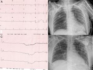 A 75 year-old woman with no previous remarkable clinical history was admitted to hospital with diagnosed COVID-19 diffuse bilateral pneumonia. She was treated with hydroxychloroquine, lopinavir-ritonavir, azithromycin, and methylprednisolone. On day 10 of the hospital stay, she was intubated due to severe hypoxemia. She showed a significant increase of interleukin-6 (105 pg/ml) with normal N-terminal pro-B-type peptide and high sensitive Troponin 1. Interferon beta1-b and tocilizumab were prescribed. On day 33 of the hospital stay, the patient suddenly presented sinus bradycardia and multiple sinus arrest (pauses >10 seconds), Figure 1. An echocardiogram was performed without pathological findings, and a dual chamber pacemaker was implanted without complications. The clinical course was good, and she was discharged from the intensive care unit on day 55 after admission.