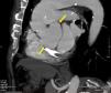 Valsalva sinus pseudoaneurysms are uncommon. The main causes for the formation of pseudoaneurysms are endocarditis, previous enlargement of the aortic root, aortic regurgitation and the use of a composite graft. We report the case of a 79-year-old man with an aortic bioprosthesis implanted five years ago to treat severe aortic regurgitation (AR) with a normal aortic root. A new diastolic murmur was heard in the last clinical review, so the patient was referred for transthoracic echocardiography, which demonstrated severe AR and a dilated aortic root. Transesophageal echocardiography (Figures 1 and 2) confirmed severe AR with an aneurysmal dilatation of the non-coronary sinus, with no signs of infection. Computed tomography (CT) confirmed severe dilatation of the aortic root (Figure 3, arrows). During surgery, a transverse fissure was detected in the intima of the non-coronary sinus. The valve was replaced with a 27-mm valve and the aortic root was remodeled using a 30-mm vascular graft.