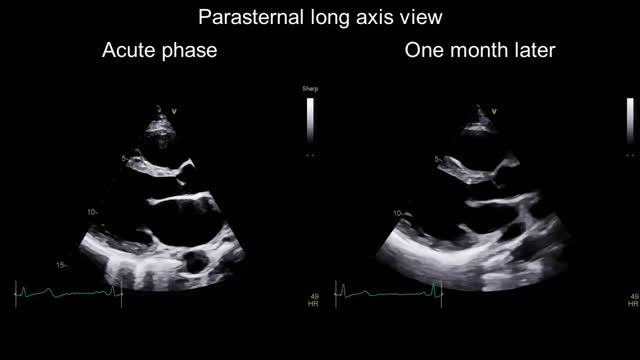 Transthoracic echocardiography findings indicating impaired basal left ventricular systolic function with basal ballooning in the acute phase and resolution of findings one month later.