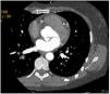 The echocardiogram subsequently performed showed a left aorto-atrial fistula located 3 mm from the aortic annulus in the non-coronary sinus next to the left commissure, aortic insufficiency grade 2/4, with valve gradient between 5-6 mmHg and pericardial effusion of 6 mm without hemodynamic compromise. Additionally, with reference to preserved global systolic function (50%), the exam revealed no dilatation of the right cavities (RA-RV gradient 20 mmHg), with mitral Doppler flow type III. Due to evidence of double contour imaging of the aortic wall, a computed tomography angiogram was performed which identified a type A aortic dissection and dissection of the celiac trunk extending to the common hepatic artery (Figure 4). The patient was then transferred to Grenoble Hospital Center, where she underwent surgery with placement of an aorto-aortic prosthesis, aortic valve replacement with a Carpentier bioprosthesis, and fistula closure. The echocardiogram performed after surgery confirmed good global systolic function, a small periprosthetic leak, and minimal mitral insufficiency, with no dilatation of the right cavities.