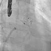 After the Amplatzer was completely deployed, radioscopy confirmed the relationship between the distal lobe of the device and the coronary artery. Although in this patient this latter structure was easily delineated by the previously implanted stents, it is vital to consider this anatomical relationship during the occlusion procedure.