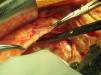 During the procedure, the thickened pericardial membrane was completely removed (Figure 4), and pleural and pulmonary biopsy specimens were taken. Anatomopathological study of the specimens showed marked fibrous thickening of the pericardium with focal congestion and nonspecific chronic inflammatory infiltrate, and several focal dystrophic calcifications; areas of pleural fibrous thickening with anthracotic pigment; and areas of emphysema and interstitial fibrosis, congestion and mild nonspecific chronic focal inflammatory infiltrate in pulmonary tissue.