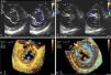 A,B – 2D janela transgástrica. Em diástole (A), observa‐se o aspeto trifoliado do componente esquerdo da válvula AV e a «fenda» (*). Em sístole (B), evidencia‐se a regurgitação mitral com ponto de partida na «fenda».