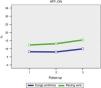 A média de carga arrítmica foi de 6,64% no grupo ATP_OFF e 7,51% no grupo ATP_ON (p=0,845) no momento M1, passando para 6,57% no grupo ATP_OFF e 7,39% no grupo ATP_ON no momento M2 (p=0,867). No momento M3 esta foi de 12,68% no grupo ATP_OFF e 9,5% no grupo ATP_ON (p=0,653). Apesar de não se encontrarem diferenças estatisticamente significativas, verificou‐se uma tendência favorável ao grupo ATP_ON, na medida em que este apresentou um aumento mais discreto na percentagem de carga arrítmica, conforme representado na Figura 1.