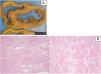 Patient 3: pathologic features of the explanted heart. (A) Macroscopy of heart section revealing features of dilated cardiomyopathy; (B) microscopic features (H&E stain) revealing interstitial fibrosis, hypertrophic cardiomyocytes and scattered adipocytes (left: low power; right: high power).