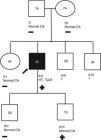 Patient 3 genogram. Square: male; circle: female; dark symbol: dilated cardiomyopathy; +/-: presence/absence of LMNA c.1003C>T variant; numbers inside symbols: current age (years); ↑ sCK: elevated serum creatine kinase; CA: cardiac assessment; HT: heart transplantation; ?: unavailable for clinical/genetic assessment.