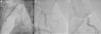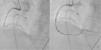 Foi orientada para angioplastia primária, não sendo passível a sua execução por via radial pela tortuosidade da artéria subclávia (Figura 1A). O acesso femoral foi dificultado pela ausência de pulso, sendo a punção guiada por contraste (Figura 1B e 1C); constatou‐se oclusão da ilíaca externa, ultrapassada utilizando uma guia hidrofílica. Observou‐se oclusão do segmento médio da coronária direita por trombo (Figura 2A), sendo realizada trombectomia (Figura 2B).