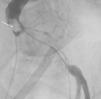 Após reperfusão, a doente mantinha sinais de hipoperfusão restritos aos membros inferiores. Este achado, aliado ao difícil acesso femoral, motivou a realização de aortografia, que evidenciou oclusão trombótica da aorta abdominal infrarrenal com extensão às ilíacas (Figura 3). No ecocardiograma visualizava‐se uma massa na aurícula esquerda, compatível com trombo (Figura 4). Foi efetuada tromboembolectomia do eixo ilíaco esquerdo e pontagem femoro‐femoral; contudo, a doente evoluiu com quadro de disfunção multiorgânica com desfecho fatal.