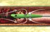 Diagram of the AngioJet® catheter with its dual lumen, an intake lumen through which a high-pressure saline jet is pumped and an exhaust lumen through which the thrombus is removed. Three orifices in the catheter tip enable three high-pressure jets to form towards the exhaust lumen, which creates a pressure gradient to fragment and aspirate the thrombus.