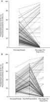 Figura 3.A e B – Variação da probabilidade teórica de DC obstrutiva nos indivíduos dos 2 grupos de estudo, de acordo com o teorema de Bayes. A linha pontilhada representa a razão de verosimilhança negativa ou positiva, assumindo os valores de sensibilidade e especificidade considerados para cada teste. Os círculos a cheio representam os valores de probabilidade pós-teste de cada indivíduo nos grupos A e B.