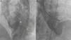 (A) Left ventriculogram during systole showing contrast leaking into the pseudoaneurysm (asterisk) (size 92 mm×60 mm); (B) left ventriculogram after deployment of Amplatzer septal occluder (20 mm) showing complete closure of the defect.