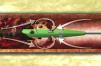Representação esquemática do cateter AngioJet®. Este cateter tem um duplo lúmen: um lúmen afluente por onde passa um jato salino de alta pressão e um lúmen efluente para remoção do trombo. Três orifícios na ponta do cateter permitem que três jatos de alta pressão se formem na direção do lúmen efluente. Estes jatos criam um gradiente de pressão que atrai o trombo para fragmentação em pequenas partículas.