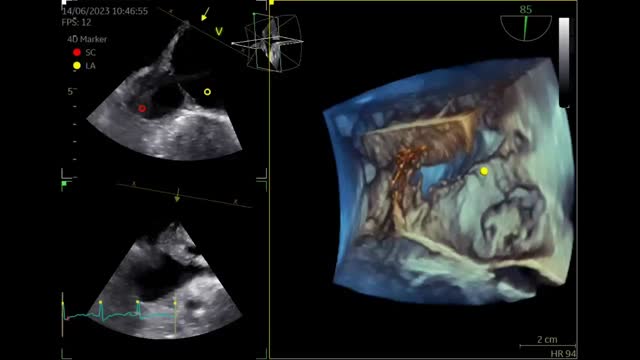 Besides her known conditions, the TTE showed a dilated coronary sinus (CS) and right ventricle that was not proportional to the MR. Transesophageal echocardiography (TEE) revealed prolapse of the mitral valve anterior leaflet (Figure 1A). The CS was markedly dilated, with no opacification after saline injection (Figure 1B). There was echo dropout in the left atrial wall and communication with the CS, raising the suspicion of unroofed CS (URCS) atrial septal defect (ASD). Three-dimensional echocardiography showed absence of the CS wall (Figure 1C) and the already known PFO (Figure 1D). Coronary computed tomography angiography (CCTA) confirmed the diagnosis of URCS (Figure 1E and F). Right catheterization showed a cardiac index of 11.47 l/min/m2, pulmonary artery pressure of 47 mmHg, and significant left-to-right shunt (Qp/Qs 2.2). The patient underwent mitral valve replacement and ASD closure. The PFO was left open. Postoperative course was uneventful and the patient was still asymptomatic at one year.