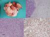 (a) Part of the heterogeneous irregular excised mass (5 cm×3 cm); (b) predominant pattern consisting of myxochondromatous tissue, mimicking common myocardial myxoma and mature lobular cartilage (H&E ×200); (c) intermingled in the myxoma pattern, highly proliferative areas consisting of fusiform and polygonal eosinophilic cells with nuclear atypia (H&E ×200); (d) atypical cells expressing cytoplasmic vimentin and immunonegative for CD3, S100 protein and CD68 (vimentin ×100).