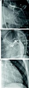(A) Left coronary angiography: left anterior descending artery occluded distal to the calcified aneurysm (arrow). (B) Left coronary angiography showing calcified aneurysm (arrows). (C) Left coronary angiography: occluded left anterior descending artery with late retrograde filling by collaterals from the left coronary circulation (arrows).