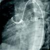 At the age of 11, he was referred to the pediatric cardiology department due to angina and exertional dyspnea of one month's evolution. The chest X-ray revealed a round area of calcification in the upper left portion of the cardiac silhouette (Fig. 1). There were no alterations on the electrocardiogram (ECG). Echocardiography showed ectasia of the left coronary artery of 4 and 5mm in the proximal and distal segments, respectively, with no wall motion abnormalities or mitral regurgitation. During nuclear perfusion scan with exercise, the patient reported chest discomfort at peak exercise, when the ECG showed ST-segment depression in II, III, aVF, V5 and V6. The nuclear perfusion scan during exercise showed severe hypoperfusion in the apex and the anteroseptal, apical-septal, and anteroapical segments and moderate hypoperfusion in the mid and basal segments of the anterior, inferior and inferoseptal walls, corresponding to the territories of the left anterior descending (LAD) artery and the right coronary artery (RCA), the alterations being reversed at rest. Cardiac catheterization revealed occlusion of the proximal segment of the LAD downstream of the calcified aneurysm, with retrograde filling by collateral circulation from the proximal branches of the left coronary artery (Fig. 2), and of the proximal RCA, with retrograde filling by collateral circulation from the left coronary artery (Fig. 3). Left ventriculography demonstrated good function, with no ventricular aneurysmal alterations.