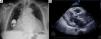 A) Radiografia de tórax a mostrar cardiomegalia, apagamento dos fundos de saco e um anel redundante do eletrocateter ventricular ao nível do aparelho valvular tricúspide. B) Ecocardiograma em modo B a evidenciar derrame pericárdico de médio volume ao nível da parede livre do ventrículo esquerdo (1,6cm) e de grande volume na parede do ventrículo direito (2,4-2,1cm).