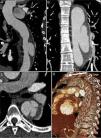 Na angioTC de controlo realizada um mês após a alta verificou‐se que tinha ocorrido rutura da íntima ao nível de uma das ulcerações da aorta e evolução para uma dissecção localizada, com imagem de pseudoaneurisma na porção proximal da aorta descendente, com dimensões de 27x51mm (figura 3). Face a isto, o doente foi novamente internado e, após discussão com cardiologia de intervenção e cirurgia cardiotorácica, foi decidido realizar tratamento percutâneo da aorta descendente (TEVAR), através da implantação de duas endopróteses (Valiant® 38x150mm e 34x150mm). A prótese proximal foi aposta à origem da artéria subclávia esquerda, sem condicionar compromisso do fluxo deste vaso, estendendo‐se a prótese distal até ao início da aorta abdominal, recobrindo‐se assim as ulcerações da aorta, o pseudoaneurisma, o canal arterial patente e a maior extensão do IMH. Na angioTC de controlo pós‐procedimento confirmou‐se o bom resultado da TEVAR e, distalmente à endoprótese distal, observou‐se uma imagem de dissecção da aorta abdominal, desde o tronco celíaco até ao nível da artéria mesentérica superior, sendo que estes dois vasos e as artérias renais tinham origem no verdadeiro lúmen (figura 4A, B e C). Não foi possível confirmar se esta dissecção estava já presente previamente à TEVAR, uma vez que a angioTC anteriormente efetuada tinha aquisição limitada à região torácica. Perante este achado, assumiu‐se uma estratégia conservadora.