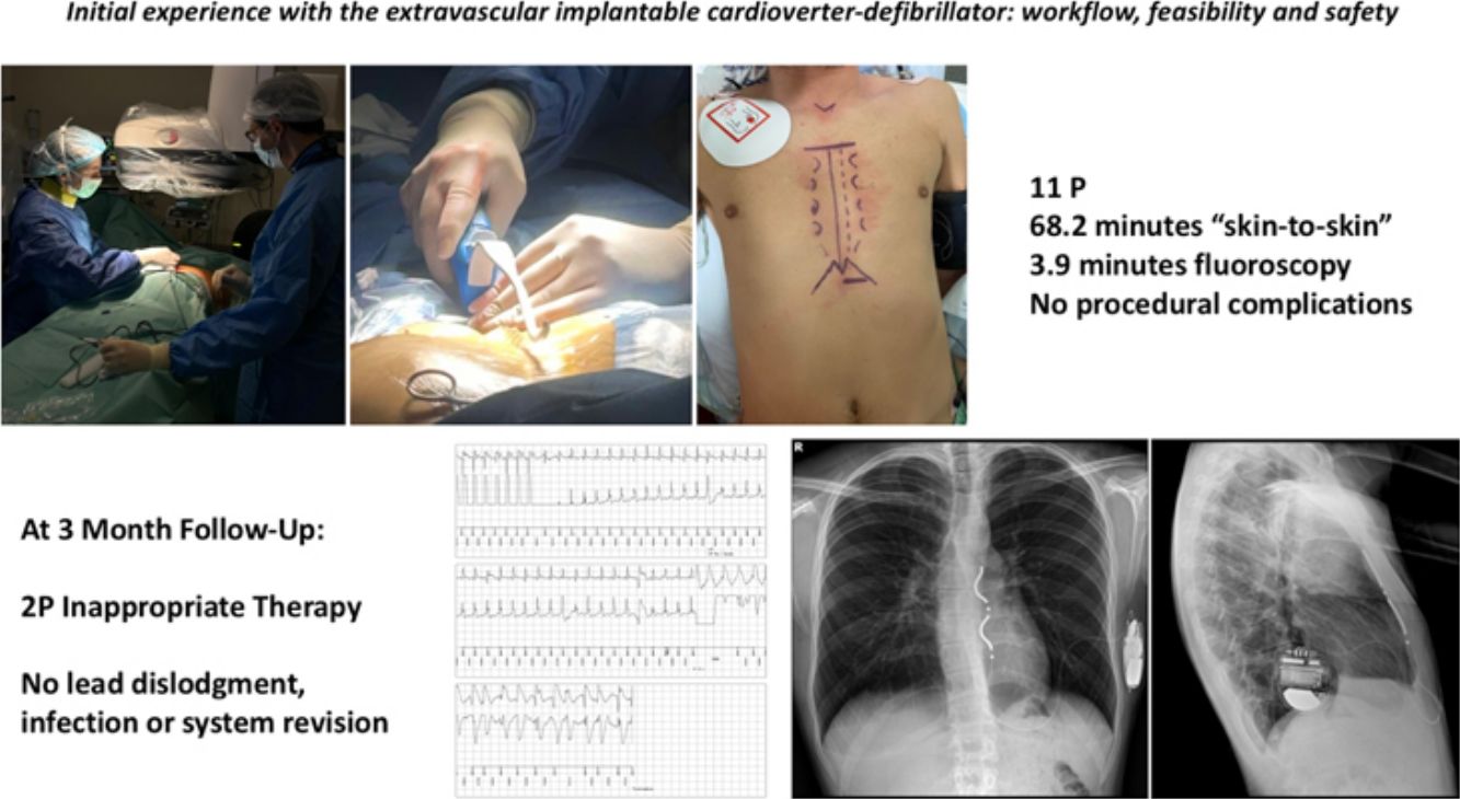 Implantable cardioverter-defibrillators (ICDs) are among the most effective interventions for the prevention of sudden cardiac death. However, traditional transvenous systems are associated with venous access and intracardiac lead complications. Subcutaneous ICDs (S-ICD), which were developed to overcome these complications, are unable to provide anti-tachycardia pacing (ATP) or pause prevention pacing. The extravascular ICD (EV-ICD) is a recent technological innovation designed to mitigate these limitations by enabling cardioversion, defibrillation and pacing without entering the central venous system. Our aim was to assess the initial experience with the new EV-ICD system, as a valid alternative to transvenous ICD and S-ICDs, including patient selection, implantation technique, procedure feasibility and safety, functional parameters, and immediate clinical outcomes.