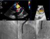 TEE revealed severe paraprosthetic regurgitation in an anterior position, close to the previously implanted devices (Figure 2B). Only one of the two devices was identified. Fluoroscopy confirmed embolization of the Amplatzer Duct Occluder to the left femoral artery (Figure 2A). Percutaneous removal was attempted but was unsuccessful and surgical removal was performed.