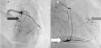 Coronariografia (A): bridging em várias localizações da artéria coronária esquerda (descendente anterior - seta preta). (B): identificam-se várias fístulas da coronária esquerda e coronária direita para o ventrículo esquerdo (seta cinzenta). Visualizava-se um trombo recanalizado no ramo póstero-lateral (seta branca).