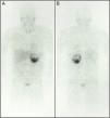 Body metaiodobenzylguanidine scintigraphy scan 24 hours after intravenous contrast administration in anterior (A) and posterior (B) views showing a pathological accumulation in the left adrenal gland compatible with pheochromocytoma (note the preferential distribution corresponding to the tumor's solid part); no other uptake foci are evident.