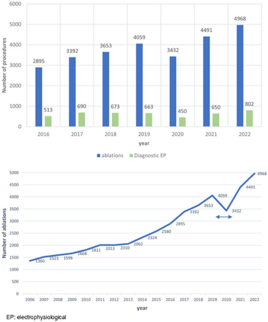 ResultsIn the 26 centers, 4491 ablations were performed in 2021 and 4968 ablations in 2022. AF ablation was the most frequently performed procedure: 1673 ablations in 2021 and 1994 in 2022, 70% paroxysmal AF, with clinically relevant complications was reported in 1.2–1.5% of the procedures. VT ablation was performed in 294 patients in 2021 (45% with structural disease), and in 331 in 2022 (42% with structural disease). Clinically relevant complications were reported in 2.7–2.4% of the procedures (2021 and 2022, respectively).