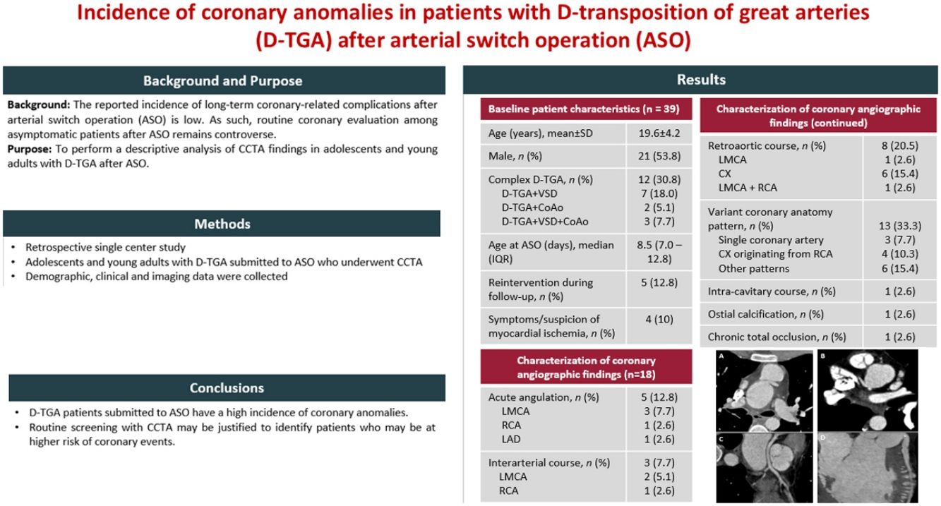 ResultsWe identified 57 patients with D-TGA submitted to ASO. Of these, 39 performed a CCTA. Mean age of patients was 19.6 (±4.2) years; 54% were male; 32% had complex D-TGA. In 35 patients (90%), CCTA was part of routine screening. In four (10%) patients CCTA was done due to symptoms or an abnormal non-invasive test suggestive of myocardial ischemia. Eighteen (46%) patients had coronary anomalies: five (13%) had an acute angulation at the coronary origin; 13 (33%) patients had anomalous origin of the coronary arteries. Interarterial course was described in two (5%) patients and retroaortic course reported in eight (21%) cases.