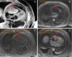 Cardiac magnetic resonance imaging showing an intracavitary mass (arrow) adhering to the lateral wall of the right atrium, measuring 56 mm×87 mm×47 mm, protruding above the atrial appendage, through the tricuspid valve, into the right ventricle and below the atrial wall. (A) Relatively homogenous high signal intensity in T2 and equal signal intensity compared to the myocardium in T1 (C and D); predominantly central enhancement throughout the perfusion study (B), with areas of peripheral hypoperfusion. Slight pericardial effusion can be seen.