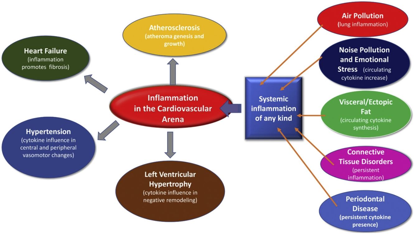 Inflammation in the cardiovascular arena1: inflammation induced by visceral fat, connective disease disorders, periodontal disease, emotional stress, and pollution (under several forms) can increase circulating cytokines2; this increase in systemic inflammation favors atheroma growth and instability, progression of heart failure, negative vascular changes in hypertension and the progression of negative remodeling in left ventricular hypertrophy.