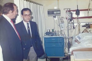 Prof Chris Barnard died in Cyprus, where he was on holiday, on September 2, 2001, shortly before he was to complete 79 years of life. Ironically, faulted by the organ which was the objective of his professional life. I was lucky to get acquainted with him during my professional passage through South Africa and a friendship later developed. He visited me in the Department in Coimbra in the early 90's (Figure). The first human heart transplantation probably influenced my own choice of a professional career. Like many others’. I believe that he was a great surgeon and a fine personality.