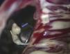 Foi reoperado (4.a vez) no dia 22 de abril de 2010. Intraoperatoriamente foi confirmada a presença de pannus na prótese aórtica, ao longo do rebordo da face ventricular do anel protésico, (Figura 3 seta), assim como visualizada uma corda solta do aparelho subvalvular mitral nativo que, por interposição, impedia de forma intermitente a oclusão eficaz dos discos da prótese mitral (Figura 4 seta). Procedeu-se então à remoção do pannus, substituição da prótese aórtica e à excisão da referida corda do aparelho subvalvular mitral nativo.